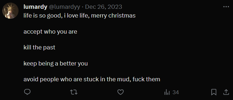 In late August 2023, he renames this Twitter account back to lumardyy, his src account to lumardy again and starts tweeting normally / building a following again. I stopped being able to look at this point. His twitter alt still exists I believe under the handle @deathgips. It’s whatever has liked this tweet.