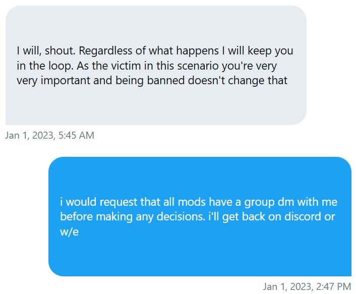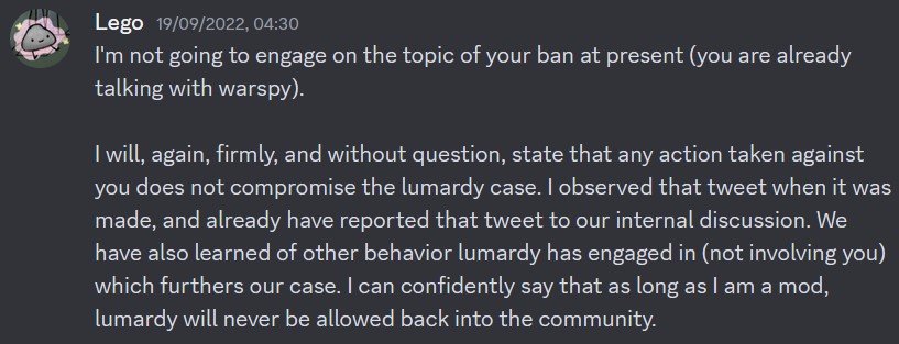 ^ this quote from warspyking, from during lumardy’s return after his staged disappearance, is taken from the warspyking twitter dm archive. of course, with warspy being allowed to continue modding, he was given an opportunity to realise another historic lie here; neither he nor any other mods kept me in the loop