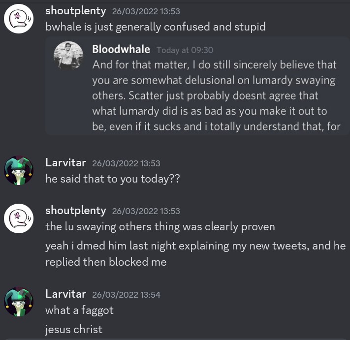 rather, i noticed inkstar supporting warspyking’s taunting me for daring to talk about warspy’s abusive nature, after moderator anmaku posted “as a mod, shut the fuck up”, turning public opinion against me when in fact i was the one who’d been socially abused by warspyking’s modding and later intimidated by his obstruction of my abuser’s anonymisation