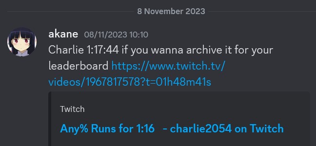 the interesting thing about inkstar and akane is that, in service of their own roles as leaderboard moderators, they have themselves used the archives they now campaign against. inkstar relinked over 100 reuploaded videos from a redacted player to the original sheet, and akane sent me an rta video, unsubmitted to the original leaderboard, for me to archive and submit. so there’s no ethical principle either of them is standing on or even pretending to stand on