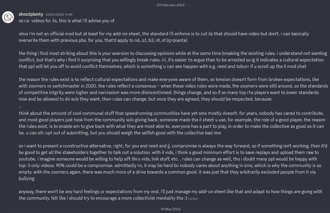 it’s an interesting thing to think about in this specific case. should anybody be allowed to write about inkstar or reed’s above-the-rules competing and moderation? was anybody allowed to criticise jjsrl for lying about having any% world record in early 2023? the sms community has usually settled with living in post-truth and cognitive dissonance even in situations that don’t concern bullying and abuse – but not to mention the ones that do.